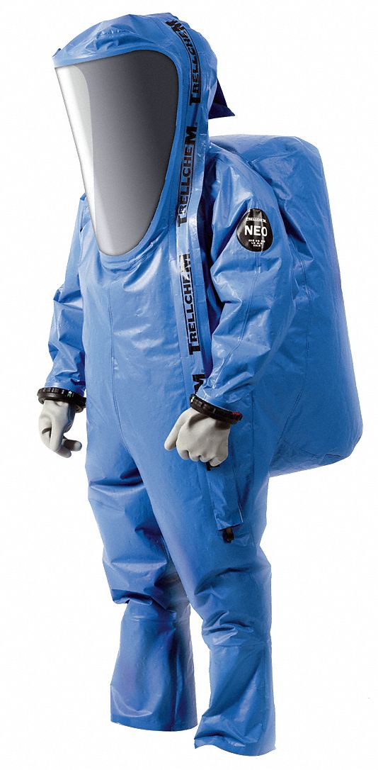 This lakeland chemmax 4 41450 level b disposable encapsulated suit with rear entry and expanded back is a totally encapsulating suit tes for protecting workers from hazardous materials in chemical manufacturing hazardous waste cleanup and pesticide application.